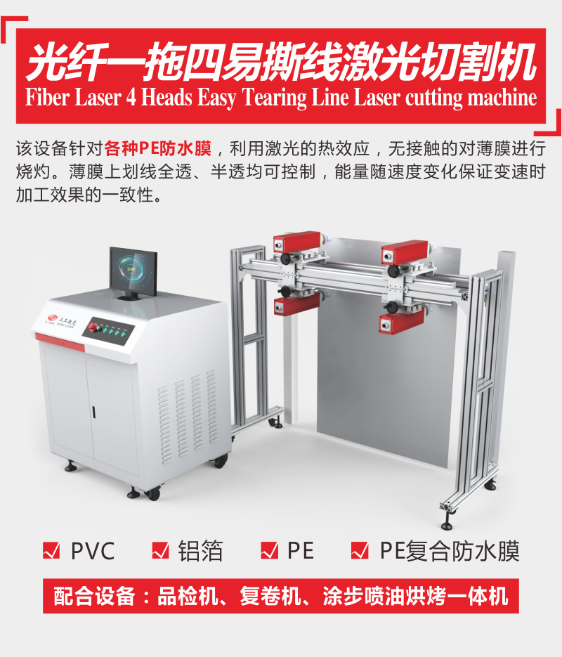 該設(shè)備針對各種PE防水膜,利用激光的熱效應(yīng),無接觸的對薄膜進(jìn)行燒灼。薄膜上劃線全透、半透均可控制,能量隨速度變化保證變速時加工效果的一致性。