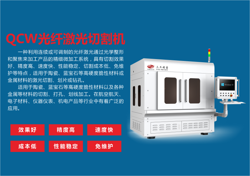 一種利用連續(xù)或可調(diào)制的光纖激光通過光學整形和聚焦來加工產(chǎn)品的精細微加工系統(tǒng),具有切割效果好、精度高、速度快、性能穩(wěn)定、切割成本低、免維護等特點,適用于陶瓷、藍寶石等高硬度脆性材料或金屬材料的激光切割、劃片或鉆孔。適用于陶瓷、藍寶石等高硬度脆性材料以及各種金屬等材料的切割、打孔、劃線加工。在航空航天、電子材料、儀器儀表、機電產(chǎn)品等行業(yè)中有著廣泛的應用。