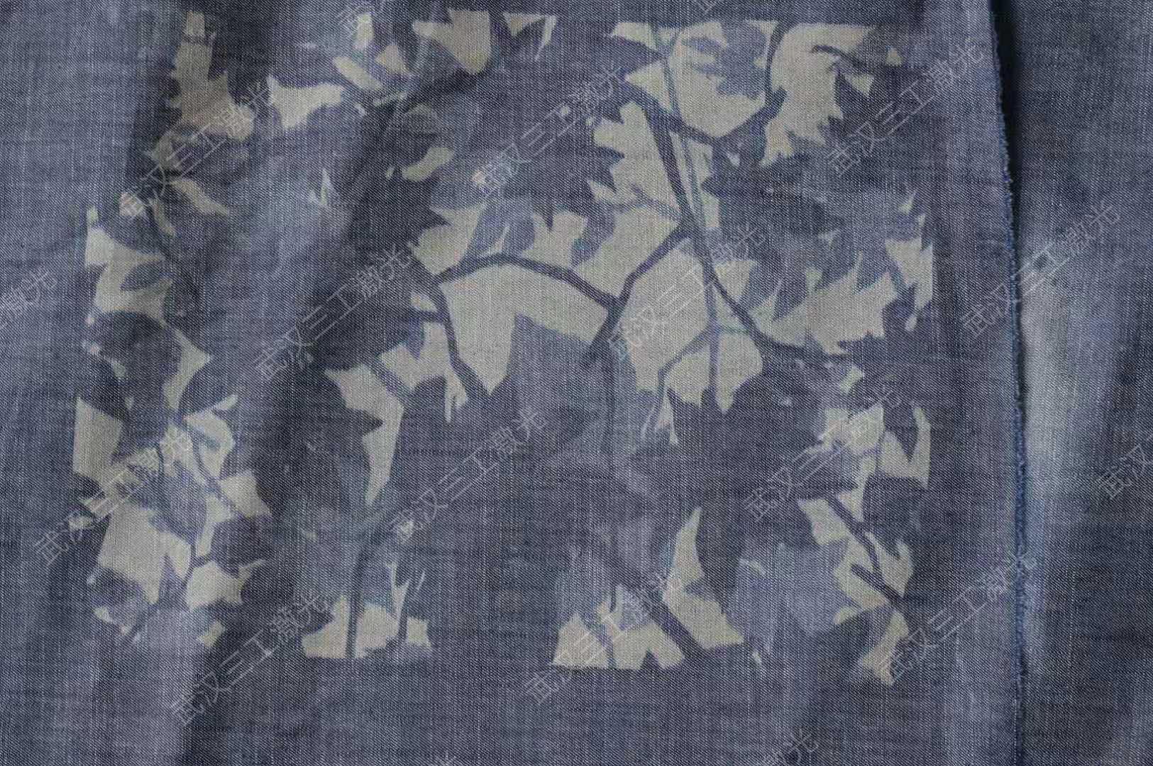 用計(jì)算機(jī)進(jìn)行圖案設(shè)計(jì)、排版,并制成文件,然后使用CO2激光打標(biāo)機(jī),使激光束依照計(jì)算機(jī)排版指令,在服飾面料的表面進(jìn)行高溫刻蝕,受高溫刻蝕部分的紗線被燒蝕、燃料被氣化,形成不同深淺層次的刻蝕,產(chǎn)生圖案或者其他洗水整理效果。這些圖案還可以使用繡花 、珠片、燙片、金屬配飾等材料再做修飾,已增強(qiáng)藝術(shù)效果。