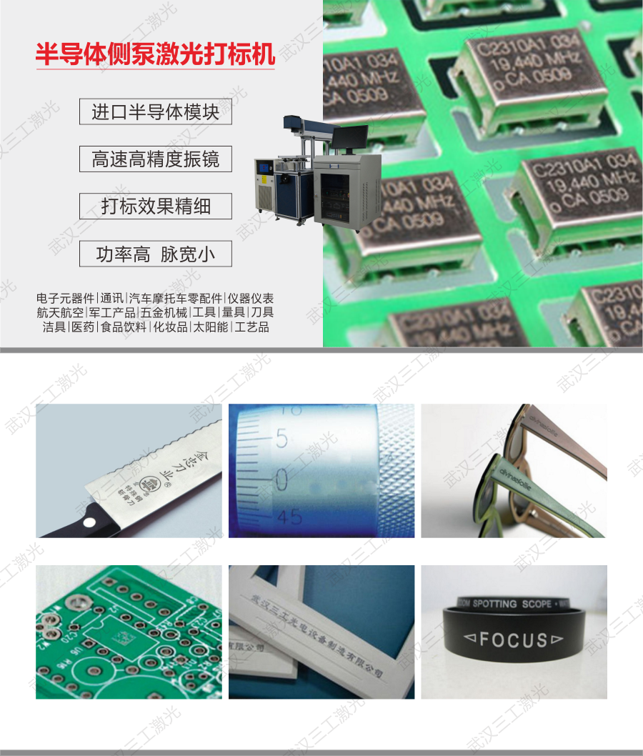 該設(shè)備適用于電子元器件、通訊、汽車摩托車零配件、儀器儀表、航空航天、軍工產(chǎn)品、五金機(jī)械、工具量具刃具、潔具、醫(yī)藥、食品飲料、化妝品、藥品包裝、醫(yī)療器械、太陽(yáng)能、工藝品等行業(yè)的各種金屬和部分非金屬打標(biāo)。