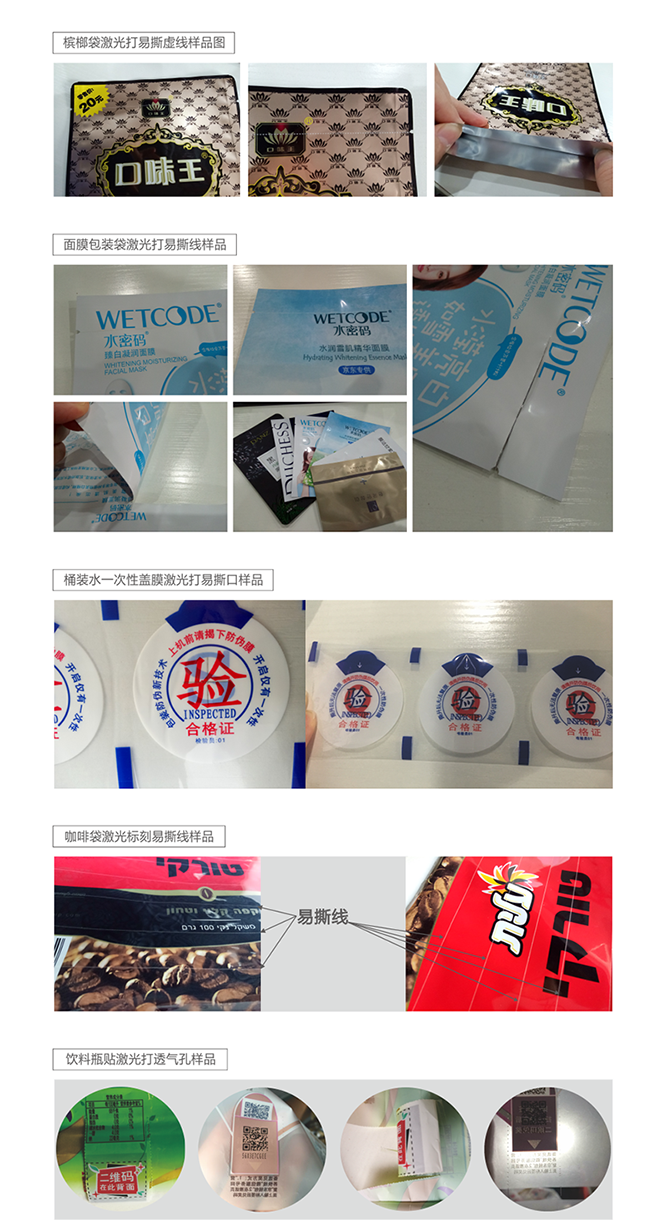 武漢三工激光是國內(nèi)率先針對薄膜包裝行業(yè)提出激光代替機械加工工藝的企業(yè),專為薄膜易撕線、定量透氣孔而設(shè)計與開發(fā)的。與傳統(tǒng)的機械齒輪壓孔相比速度更快,孔徑孔距大小可調(diào)更加均勻,可以實現(xiàn)任意方向任意形狀易撕孔(線)標刻。激光工藝制作是一種瞬間高溫處理使孔周圍熱融保護,因此完全解決了后期熱收縮后出現(xiàn)的斷裂現(xiàn)象,在手感上也非常平滑,在感官上給客戶一種新的體驗。激光易撕線和透氣孔的諸多優(yōu)勢我們前面已經(jīng)講到過很多,再次不做贅述,下面一起來看一下我們易撕線激光打孔劃線機做的不同行業(yè)以及材料的樣品吧!
